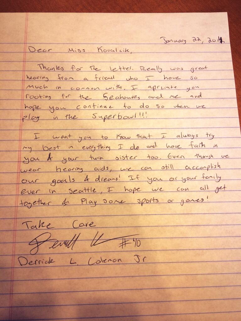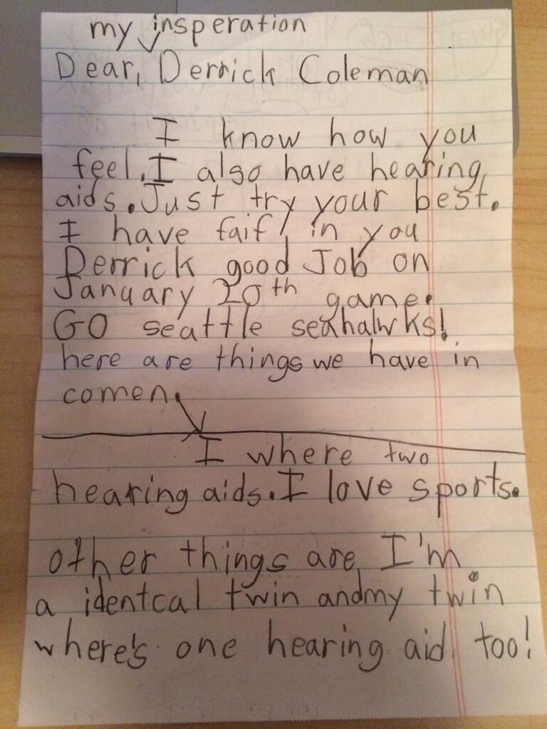 Wilson, Seahawks’un tek ilgi çekici adamı değil. Derrick Coleman, Amerikan Futbol Ligi tarihinde tamamen işitme engelli olan ilk oyuncu. Geçen hafta New Jersey’li küçük bir kız Coleman’a bir mektup yazdı. Babasının Twitter üzerinden muhatabına ulaştırdığı mektuba göre işitme engelli iki kız kardeş Coleman’ın mücadelesinden ilham buluyorlardı. Coleman da kendi elyazısıyla bir mektup yazıp kızlarla paylaştı: “İşitme cihazları da kullansak kendi hayallerimizi ve hedeflerimizi gerçekleştirebiliriz!”